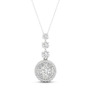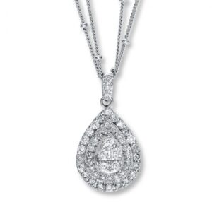 This enchanting diamond necklace serves as a beautiful reminder that through life's twists and turns, love keeps you centered. Featuring a stunning round center diamond and surrounded by an interwoven swirling design of diamonds, the pendant has a total diamond weight of 1/10 carat. The pendant is crafted of sterling silver and hangs on an 18-inch cable chain that secures with a spring ring clasp.